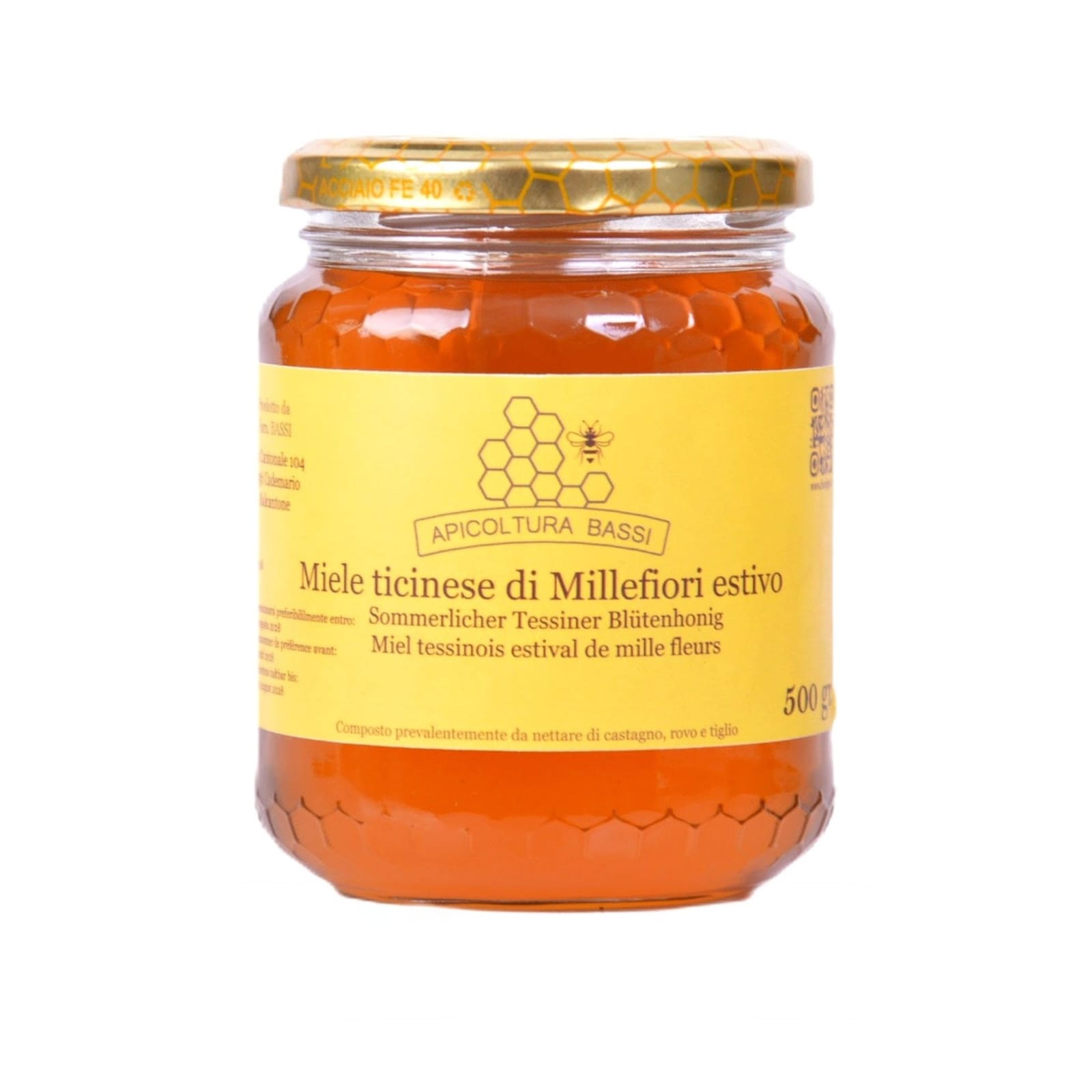 Miele ticinese di millefiori estivo, composto prevalentemente da nettare di castagno, tiglio e rovo. Unendo l’amaro del castagno con il dolce degli altri fiori, ha un gusto deciso e unico.